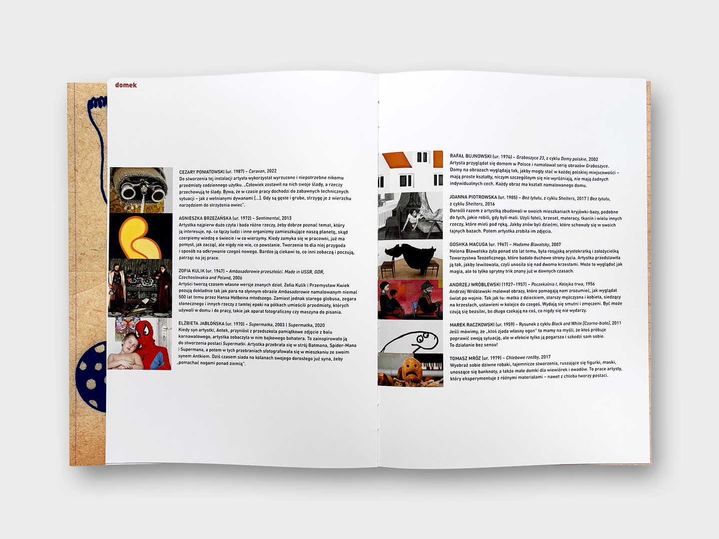 Publikacja podzielona jest na osiem części, a każda z nich prezentuje dzieła sztuki krążące wokół wybranego tematu – między innymi uczuć, natury, przyjaciół. Najpierw zajrzyjmy do segmentu DOMEK. Szczególnie ujął mnie projekt Elżbiety Jabłońskiej zatytułowany „Supermatka”, składający się z fotografii, które dzieli aż siedemnaście lat. Pewnego dnia syn artystki, Antek, wrócił z przedszkola ze zdjęciem z balu karnawałowego. Właśnie w tym momencie Elżbieta Jabłońska zobaczyła w nim nie tylko małego chłopca, ale także bajkowego bohatera. Ta myśl zainspirowała ją do stworzenia postaci Supermatki. Przebrała się w strój Batmana, Spider-Mana i Supermana, po czym sfotografowała się w mieszkaniu razem ze swoim synem na kolanach. Tak naprawdę wykonała nie tylko intrygujący autoportret w kostiumie. Jej projekt jest hołdem oddanym wszystkim mamom, które codziennie muszą zamieniać się w superbohaterki. Wykonują pracę, często niezauważalną, którą doceniamy dopiero, kiedy dostrzeżemy jej brak. Nasze mamy zamieniają się w lekarki, malarki, kucharki, animatorki, nauczycielki i wróżki zębuszki. Co ciekawe, artystka powtórzyła sesję fotograficzną, gdy jej syn był już dorosłym mężczyzną. Dziś mówi, że niekiedy siada na jego kolanach, by „pomachać nogami nad ziemią”.