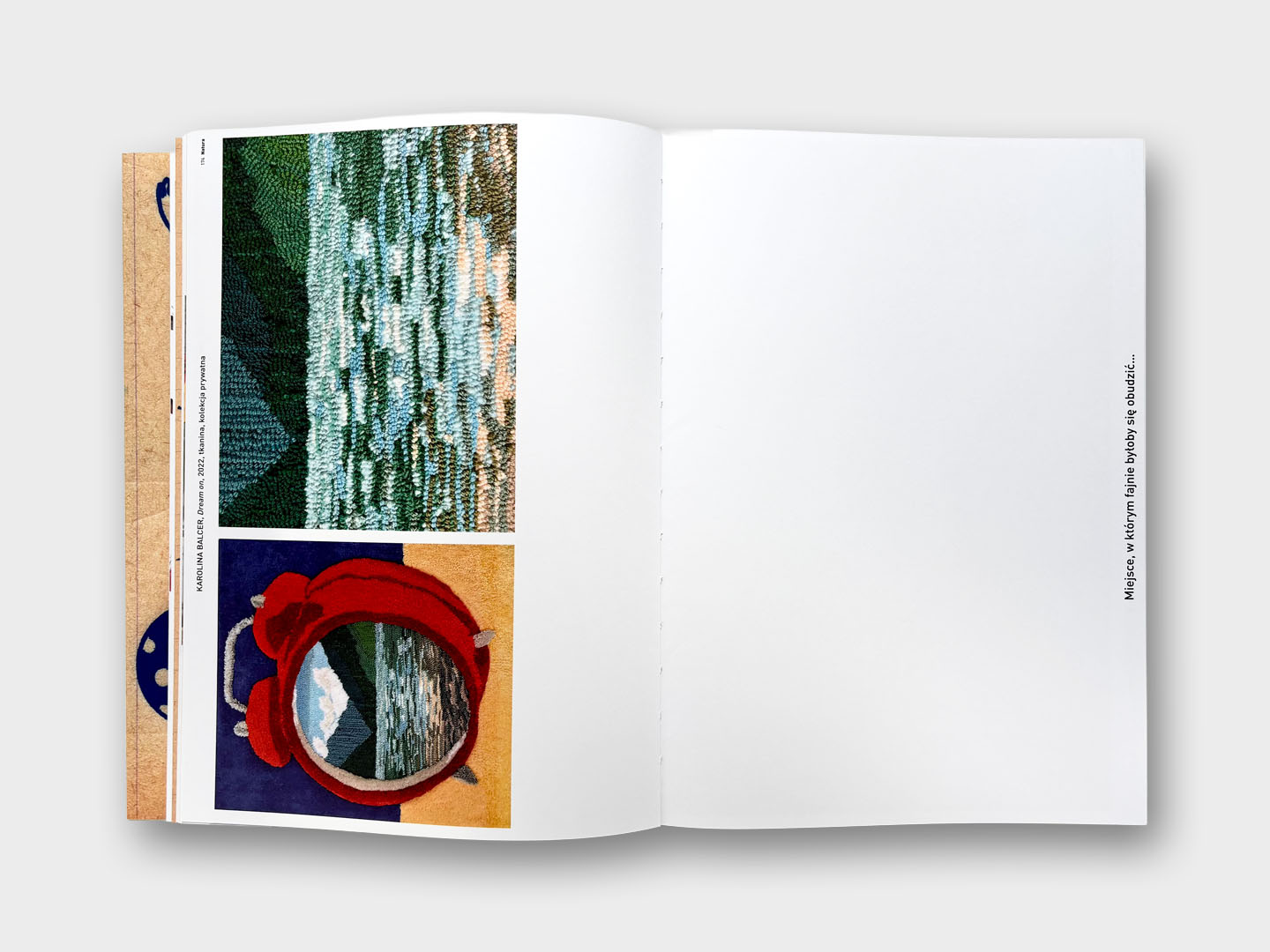 Nie odchodząc od wątku rodzinnego i zauważania detali, które na pierwszy rzut oka są niewidoczne, zdecydowanie warto zwrócić uwagę na projekt Karoliny Balcer „Happy Family”. W książce „Mój świat, moja sztuka” została zaprezentowana praca będąca częścią projektu, zatytułowana „Dream on”. Impulsem do powstania złożonego dzieła była trudna sytuacja życiowa artystki i jej brata, który okresowo doświadczał chorób psychicznych wynikających z prywatnych problemów. Choć rodzina Balcerów nie miała materialnych braków, okazało się, że trudności, z jakimi przyszło im się mierzyć, były głębsze i bardziej skomplikowane, niż początkowo mogłoby się wydawać. Posługując się tekstyliami i tkaninami, artystka stworzyła obiekty kojarzone z komfortem i wygodą. Wyszywała dywany, wycieraczki, kanapy, ręczniki, jednak pomimo swoich przytulnych form, reprezentowały one ciężkie do przezwyciężenia problemy, a miękkie tworzywa kontrastowały z mocnymi treściami. Dzieła Katarzyny Balcer jasno pokazują, że wchodząc do czyjegoś domu, w gruncie rzeczy nie mamy pojęcia, jak wygląda życie mieszkającej tam osoby, dlatego to tak istotne, abyśmy byli uważni na siebie nawzajem i stronili od bezpodstawnego oceniania.
